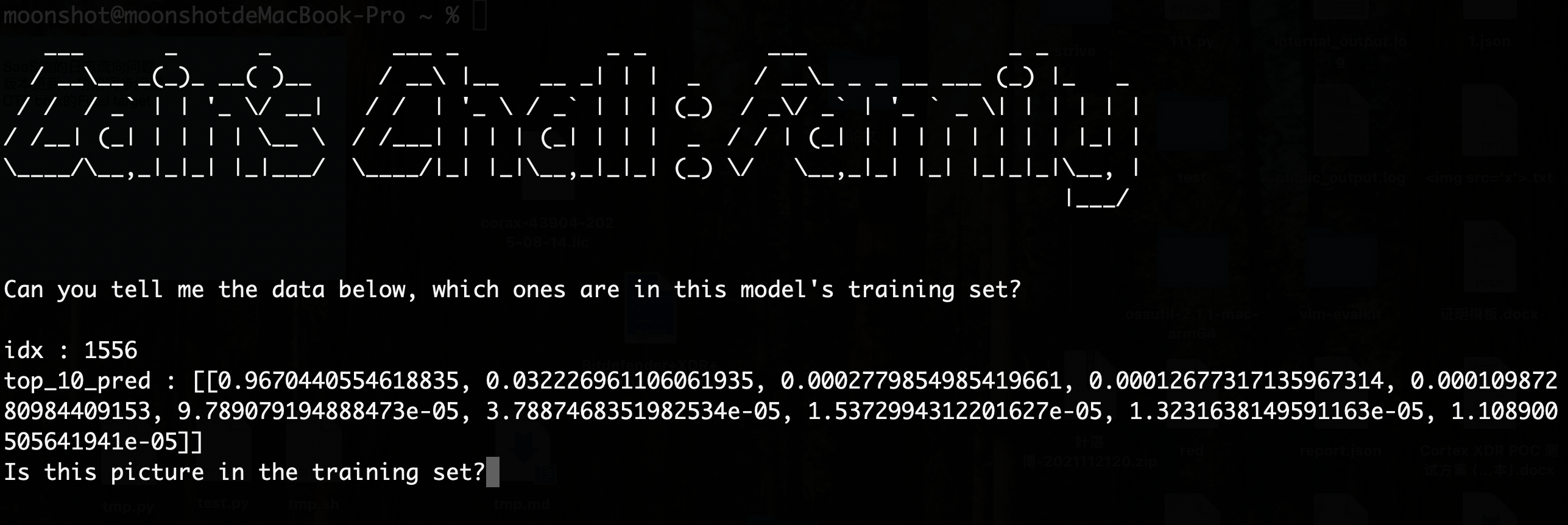 通过题目给出的,模型对于 $ idx $ 样本的 $ {pred}_{top_{10}} $ 预测值,进行判断:这个样本是否存在于当前模型的训练集中? (本题的题目简介应该注明题目交互方式。虽然赛中选手们都基本根据报错猜到了,但还是抱歉。)