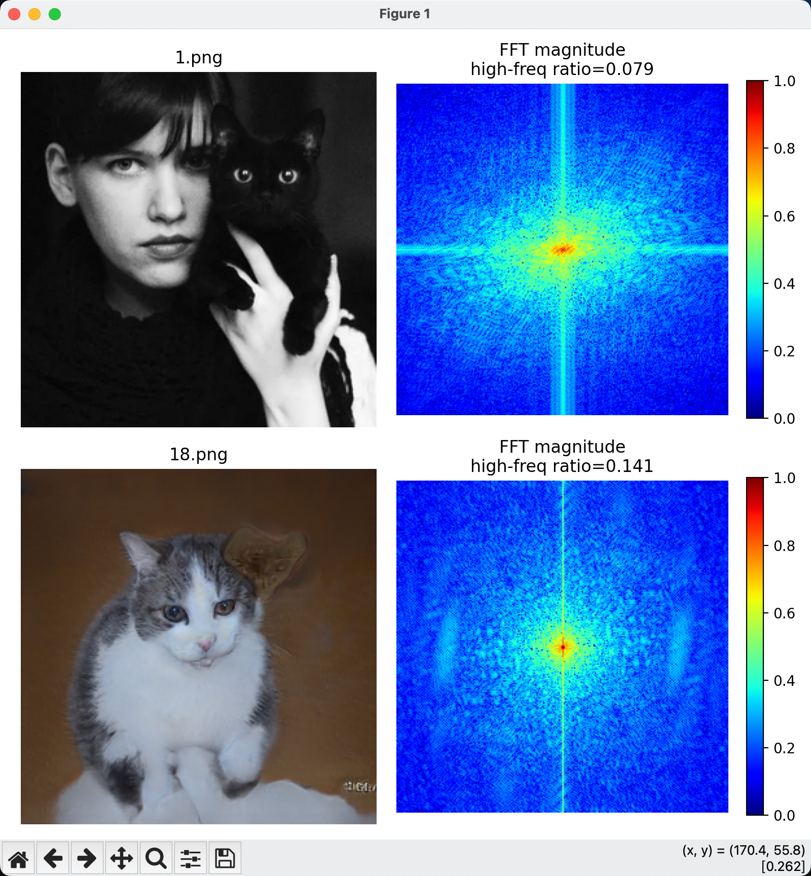 tensor = load_gray_tensor(file) mag_np = fft_magnitude(tensor) ratio = high_freq_ratio(torch.abs(torch.fft.fftshift(torch.fft.fft2(tensor)))) res = 'fake' if ratio > delta else 'real' f.write(f'{fname[:-4]},{res}\n')